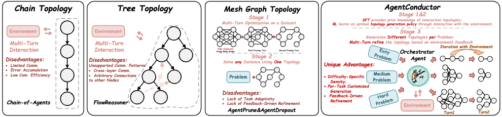 过去,多智能体系统常被视为“堆人力”的暴力解法:越多AI越好。但AgentConductor 证明,智能协作的关键不在于数量,更在于结构的适应性。它标志着多智能体研究从“静态工作流”迈向“动态生态系统”。 AgentConductor 不仅是一项工程优化,更代表了一种新范式:将多智能体协作视为可学习、可演化的结构化决策过程。 通过将任务难度、执行反馈与通信成本统一纳入强化学习框架,我们实现了准确率与效率的协同提升。