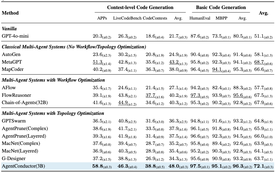 我们在三个竞赛级(APPS, LiveCodeBench, CodeContests)与两个基础代码数据集(HumanEval, MBPP)上评估 AgentConductor(基于 Qwen-2.5-3B-Instruct):
