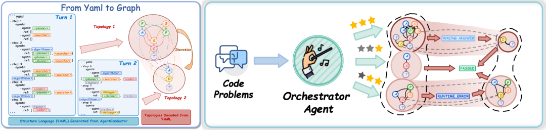 图 1.(a) 拓扑结构的 YAML 表示与实际图结构的映射;(b) AgentConductor 拓扑生成与演化过程展示