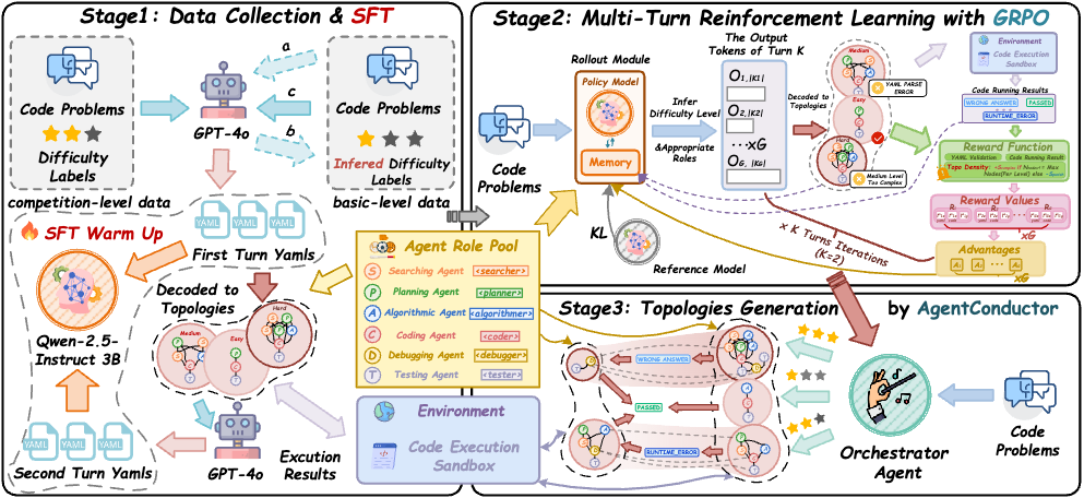 上海交通大学 i-WiN 团队最新提出多智能体框架 AgentConductor,通过引入一个经过强化学习训练后的 3B 参数指挥智能体,从根本上解决了这个问题。它会先评估任务难度,并生成一张以 YAML 表示的交互拓扑图:简单任务使用轻量团队,复杂任务则使用更复杂的交互图,实现能力与成本的自适应匹配。
