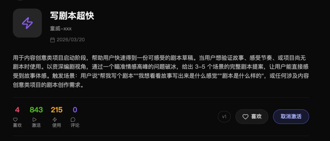 我尝试激活了其中几个 skills,用来快速写剧本和分镜。