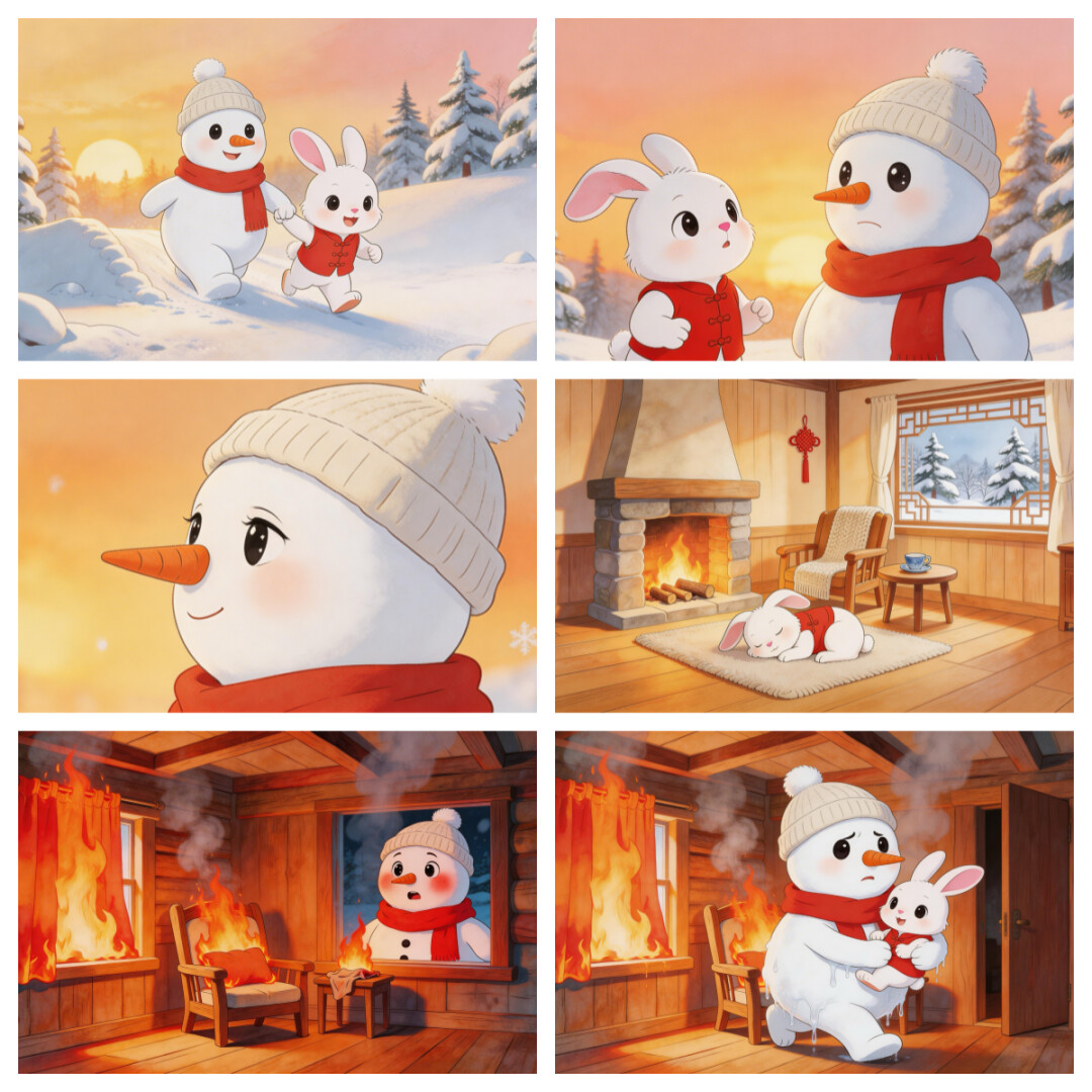在展开介绍测试细节之前,先给大家看一段成品。这个故事是大家都很熟悉的上海美术电影制片厂经典动画片《雪孩子》。借助 updream 和原片的故事框架,我只用几个小时就得到了这些片段,并把它们简单拼了起来。