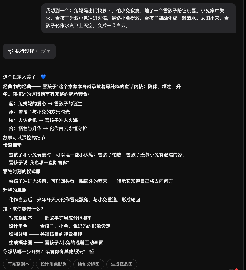 这种感觉就很微妙。一方面,对于创作流程,它是门儿清的,知道在哪一步该 cue 哪个流程,让整个创作过程井井有条。但另一方面,它又不拘泥于流程,而是给出多个可能的行动分支,充分保留创作空间。