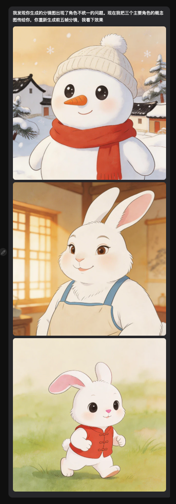 当然,和很多产品一样,并不是所有的图都是一次抽卡的结果。由于缺乏经验,没有在完成角色设定的情况下就着急生成分镜,我在前面其实遇到了角色一致性等问题。