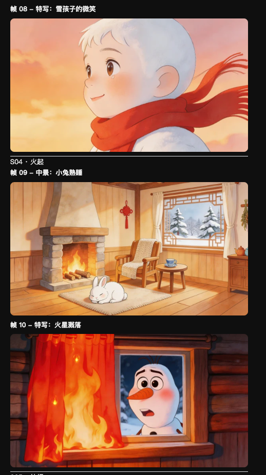 这是调用剧本 skill 后得到的结果。可以看到,这个 skill 很会抓叙事的 「呼吸感」,它给每个场景都标注了节奏,比如 「缓慢,充满爱意」「骤然紧张」,这对分镜和后期配乐可太有用了。而且,它给的细节也很到位,比如红围巾在风中飘动。在后续步骤中,这些画面感强的描述能直接转化成镜头语言,不用再额外脑补。