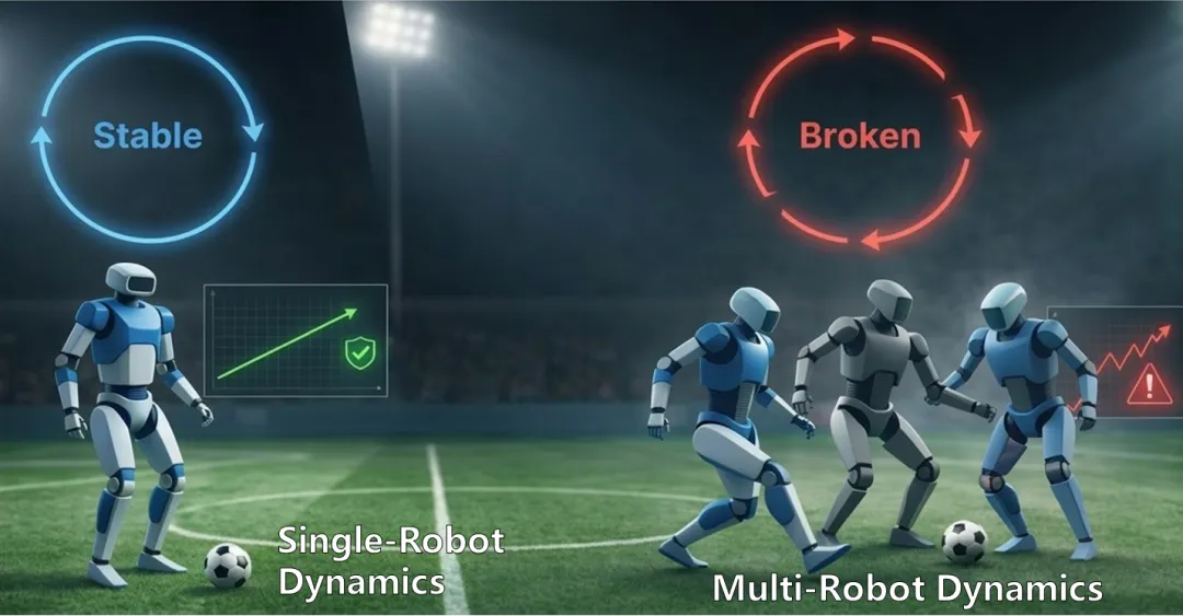 当多个机器人同时参与决策时,系统的动力学会迅速变得复杂:每个机器人的动作都会影响环境,也会影响其他机器人接下来的决策。这使得多机器人协作成为强化学习和机器人领域长期以来的核心难题。核心原因在于:世界不再由单一策略驱动,而是由多个智能体共同决定。这带来了两个关键挑战: