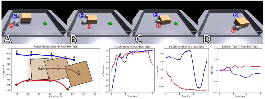 角色分工(Role Division):在推箱子任务中:一只机器人负责 主要推进力,另一只机器人负责 方向调整。这种分工并非人工设计,而是在训练中自然产生。