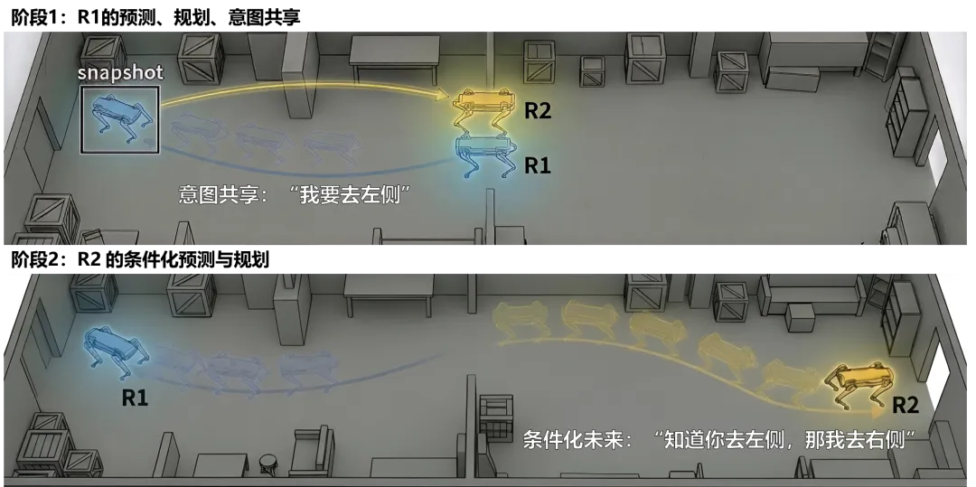 图 2:R1 先规划并共享未来轨迹,R2 据此调整路径,实现对房间的协同探索