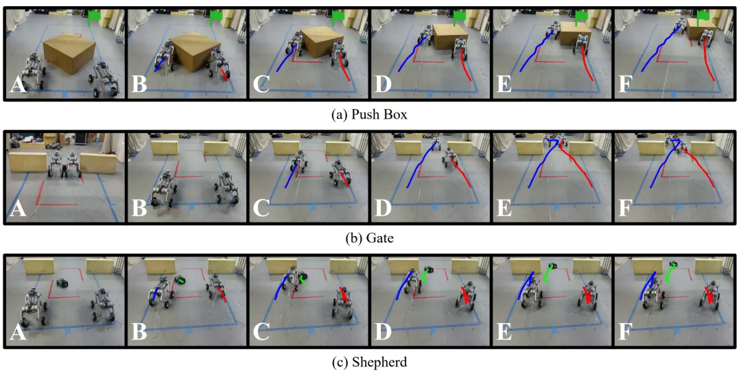 为了验证算法在真实环境中的效果,研究团队还将 SeqWM 部署到了 Unitree Go2-W 机器人平台。实验包括:推箱子、通过窄门、引导目标机器人: