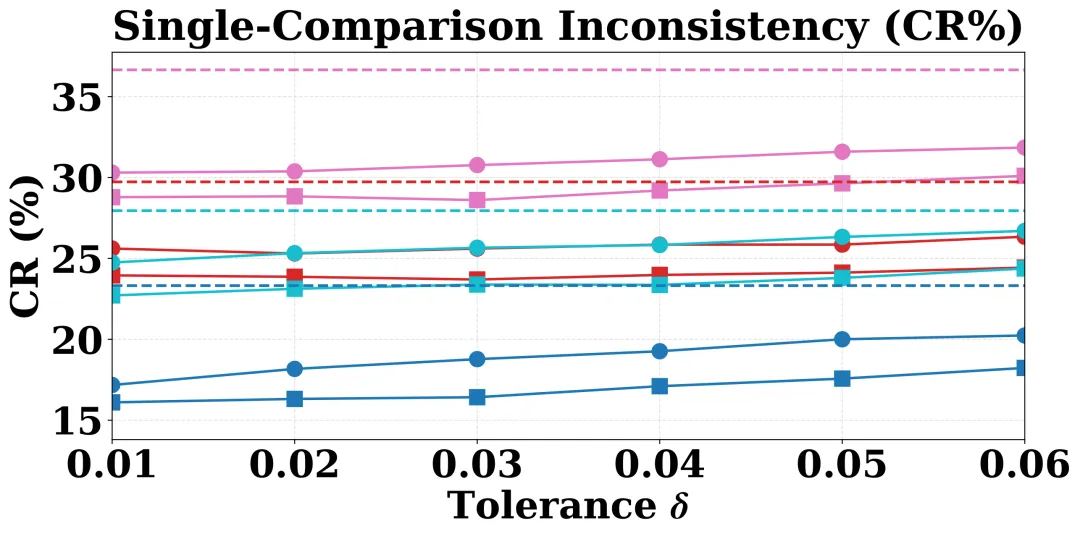 图 2:不同容忍度 δ 下的不一致性对比。TrustJudge(方块 / 三角)在各个设置下都低于 Baseline(虚线)。