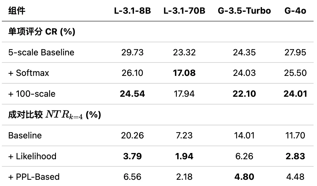表 2:逐个拆开看,softmax 归一化和 100 分制对评分不一致各有贡献;似然聚合和 PPL 方法对传递性不一致效果都很明显,似然聚合整体略优。
