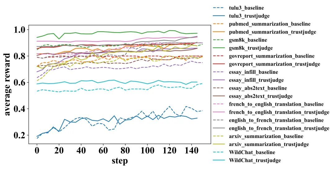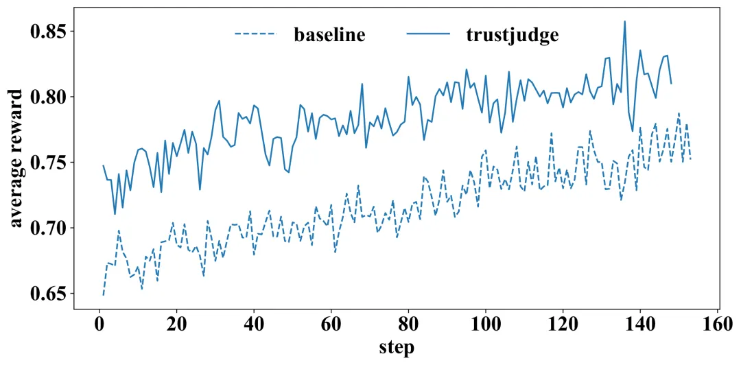 图 4:训练过程中的奖励变化。TrustJudge 的奖励信号全程高于 Baseline。