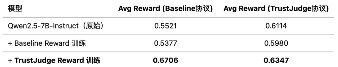 表 3:用 Baseline 奖励训练的模型在两种协议下都没超过原始模型(反而略降);用 TrustJudge 奖励训练的模型两边都涨了。