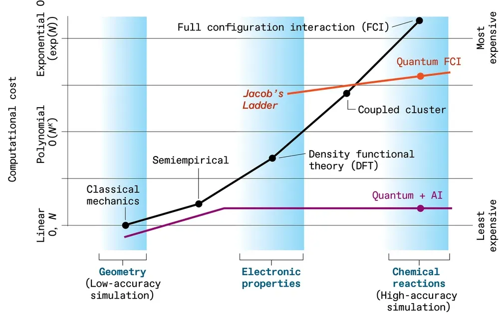 基于这个隐喻,或可将雅各布阶梯扩展到超越佩尔杜版本,涵盖所有模拟电子行为的计算方法。这是 Microsoft 团队设想的一种方式:它首先利用量子计算机生成关于电子行为的极其精确的数据——这些数据用经典计算成本高得令人望而却步。这些量子生成的数据随后将训练运行在经典机器上的 AI 模型,这些模型能够以惊人的速度预测材料的性质。