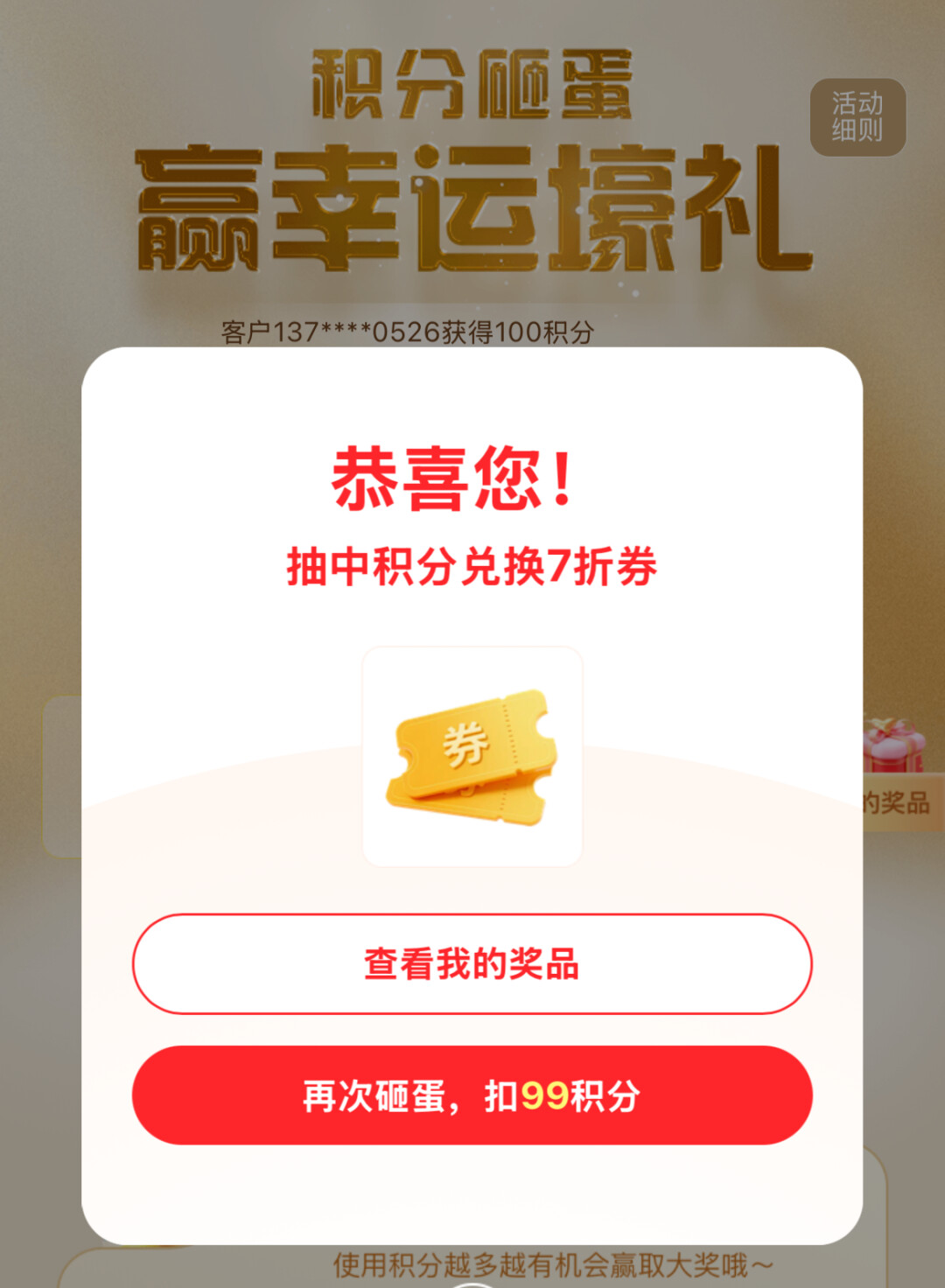 去年2折券,前年5折券,今年我拿到的是7折券,这次依旧是玩砸金蛋,连续一周,平均每天20次,昨天爆了个7折券。