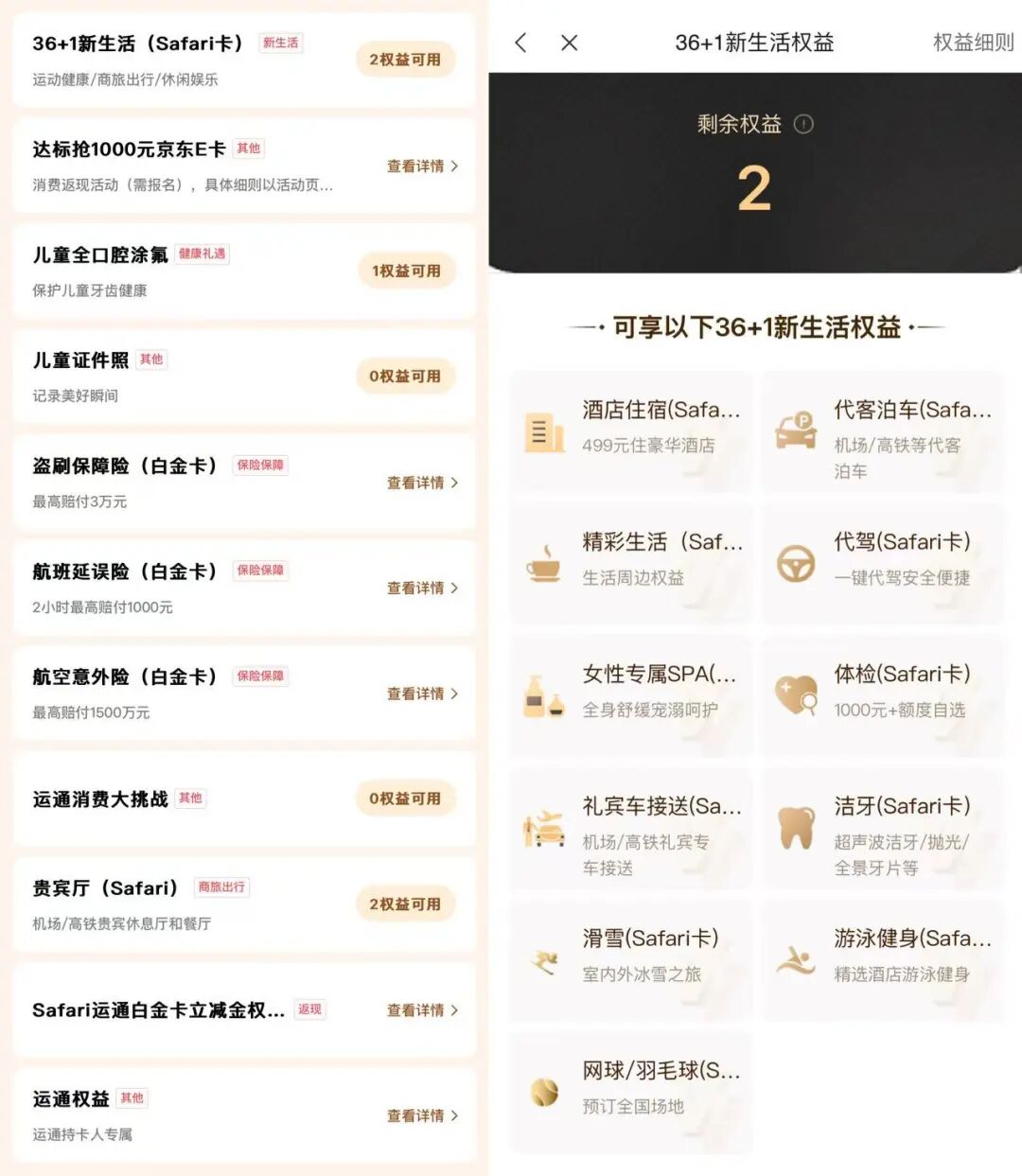 消费权益:9点/年的36+1新生活、运通消费大挑战和境外返现