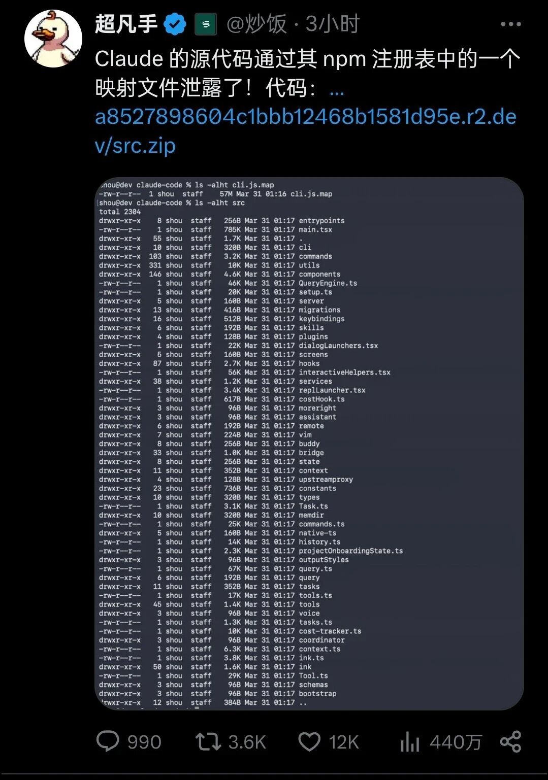 事情是这样的:Anthropic本想低调推送Claude Code的npm包更新,却因一个低级失误,直接把超1900个文件、总计51.2万行的TypeScript核心源码全盘暴露在全球开发者面前。