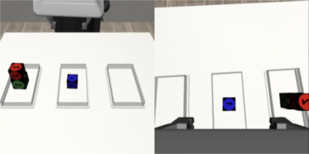 研究团队在 Robosuite 仿真环境中设计了三个难度递增的任务:单次抓取放置、3 块汉诺塔、4 块汉诺塔(后两者未见训练)。对比对象包括: