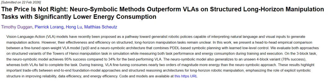 原文标题:95% vs 34%成功率、能耗降低近100倍:神经符号方法击败VLA模型