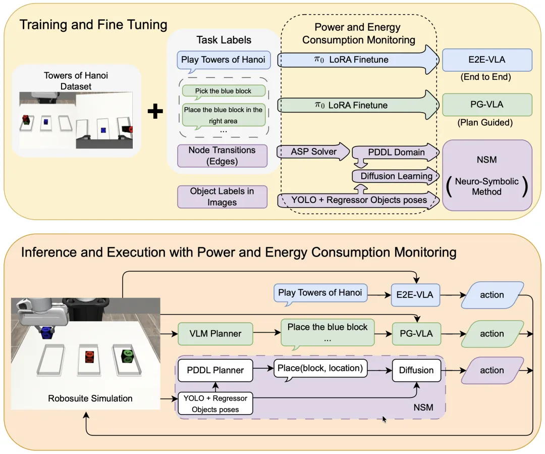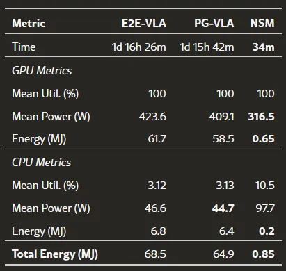 训练数据上,VLA 消耗了 300 个完整汉诺塔轨迹,而 NSM 只用了 50 个堆叠演示。硬件上所有实验在同一台 RTX 4090 上完成,并精确记录了 GPU/CPU 的功耗和能量消耗。