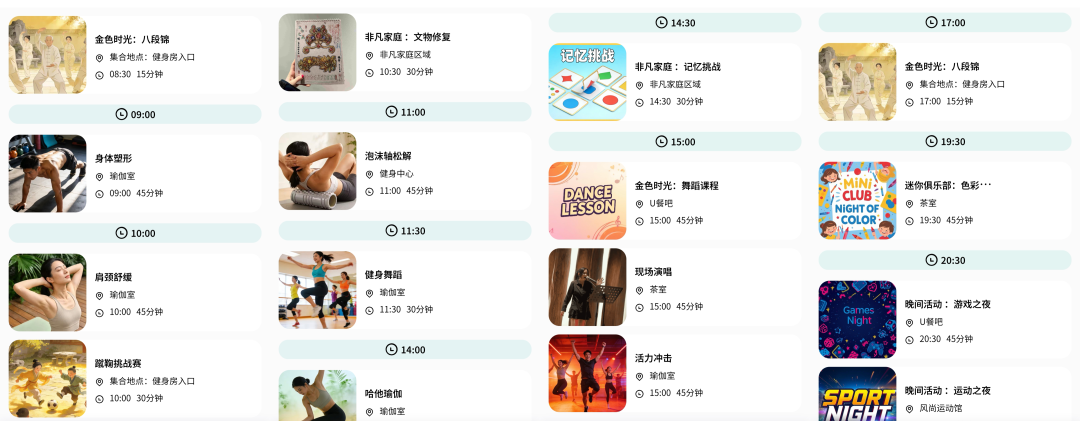 虽然试运营期间,儿童托管活动没能体验,但是这全天不间断的活动表,可是一点不含糊,而且包括大量的成人活动,八段锦、动感单车、水中有氧、空中瑜伽、24小时健身房...