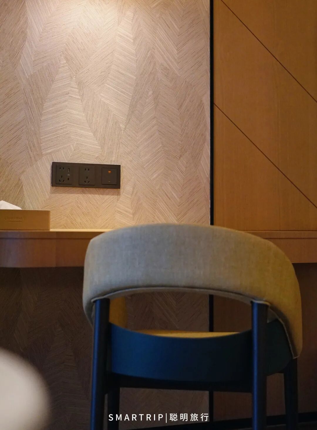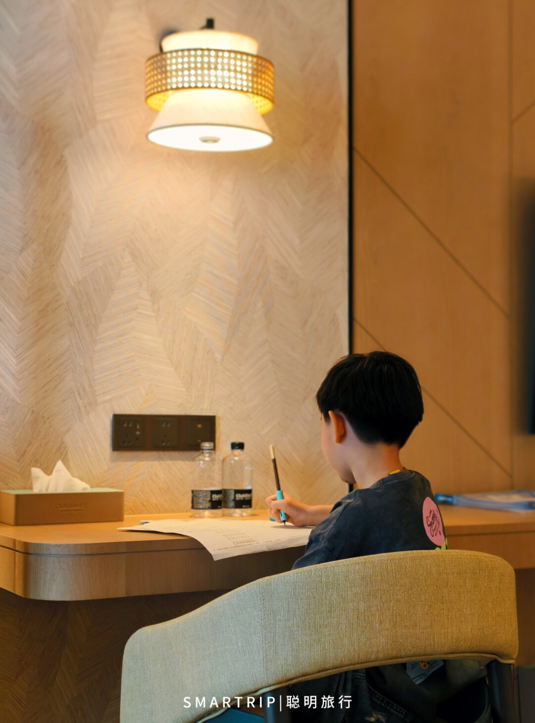 入住的是一间基础房,可以看得出来业主是舍得投入的,用料和选配都是超出常规亲子酒店定位的。主色调采用原木色,壁纸和灯饰都装饰茶叶肌理,定制的橙色小物件很讨喜。