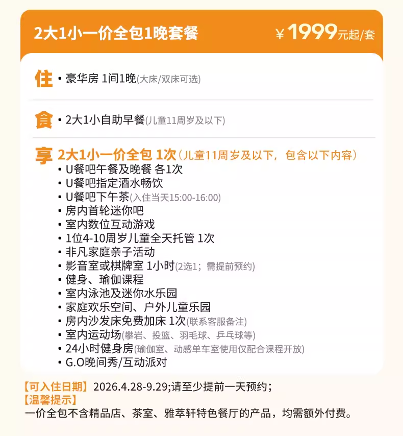开业大促套餐很有诚意,1晚套餐5月6月周五不加价,周五下班/放学可以直接出发很快到达,城市度假村的优势也体现在这里。五一加400也算友好,日历房要1500/晚了。套餐都包含2大1小的免费活动/课程、儿童乐园、室内运动馆、数位互动游戏、G.O.晚间秀和互动游戏,还有免费的沙发床加床。