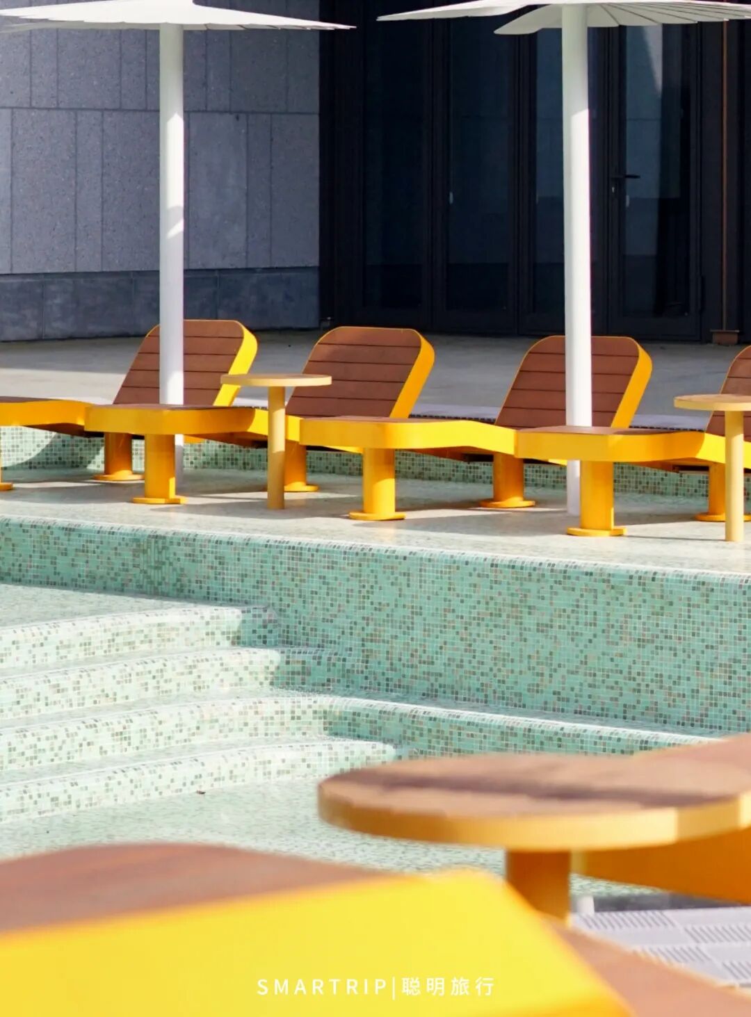 在餐厅出口处设计了个戏水池,还没蓄水的状态下,只看躺椅和遮阳伞的可爱的橙白配色,就能想象得到,这里不仅带娃好玩,还一定是个拍照出片的打卡点。