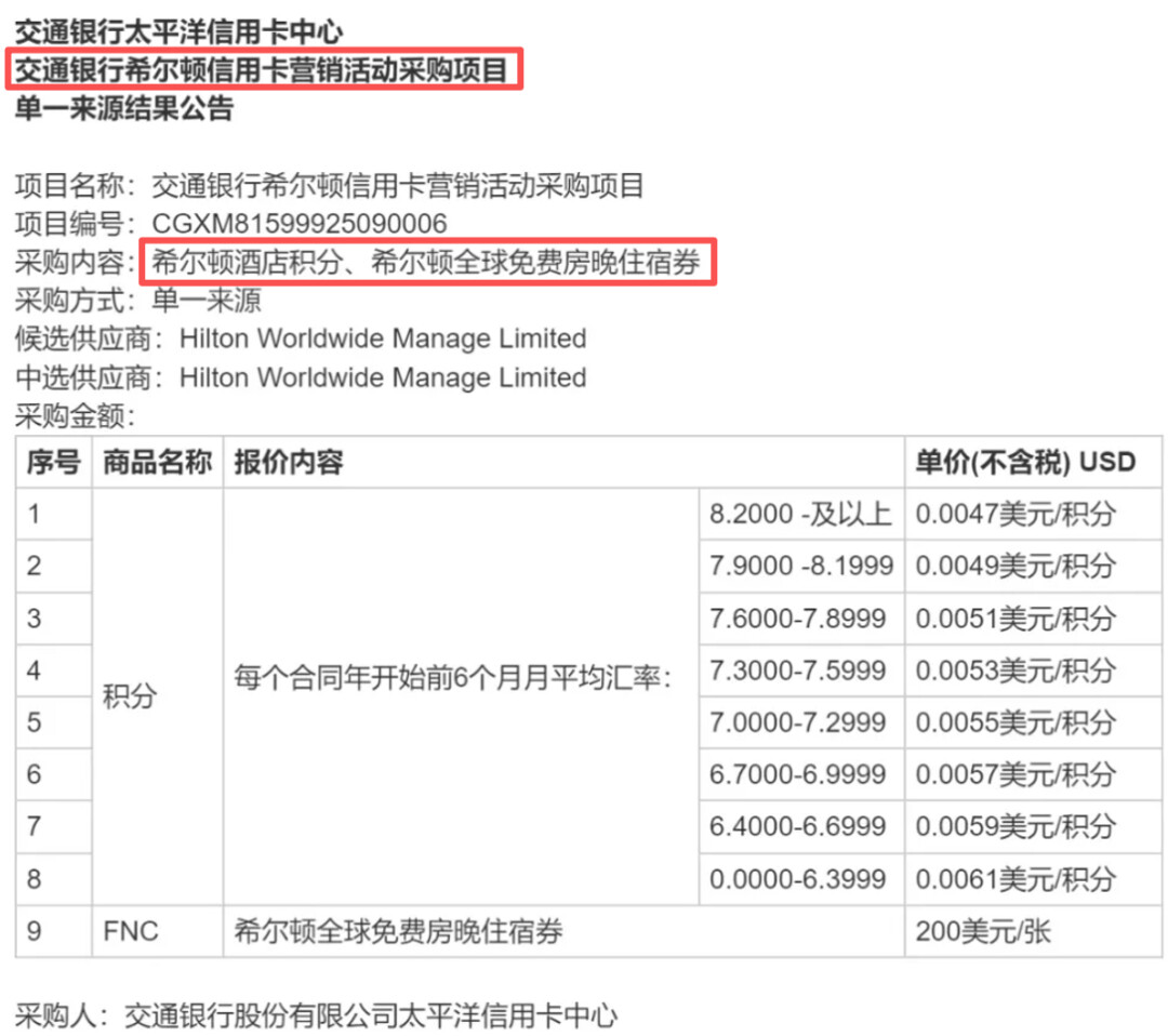 最后callback。去年11月,交行一则“交通银行希尔顿信用卡营销活动采购项目”公告发布,采购内容包括“希尔顿酒店积分、希尔顿全球免费房晚住宿券”: