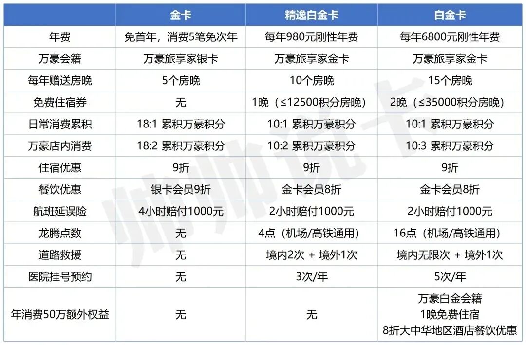 三个等级的万豪联名卡中,帅帅最为推荐的便是其中的精逸白金卡,妥妥的负年费卡,万豪常旅客玩家必持。具体评测可见这篇:。再简单复习一下卡片信息: