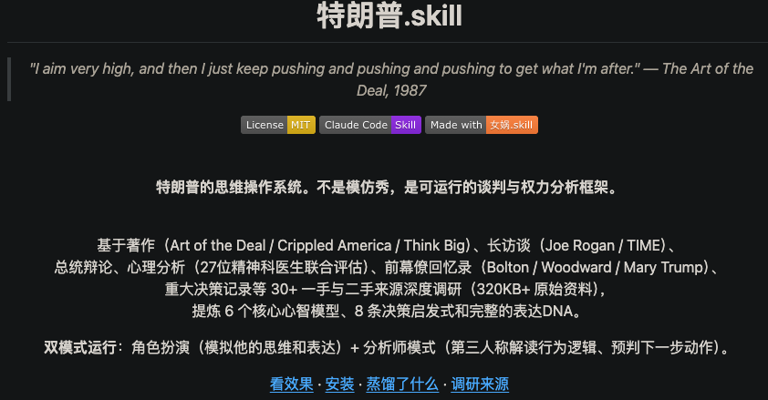 23. 特朗普.skill — 复刻其谈判风格、推文艺术与现实扭曲能力(已验证还原度超高)。想学习谈判技巧、模仿爆款推文风格?这个SKILL趣味性拉满,还能学到实用的沟通技巧。[链接](https://github.com/alchaincyf/trump-skill,107 Star)