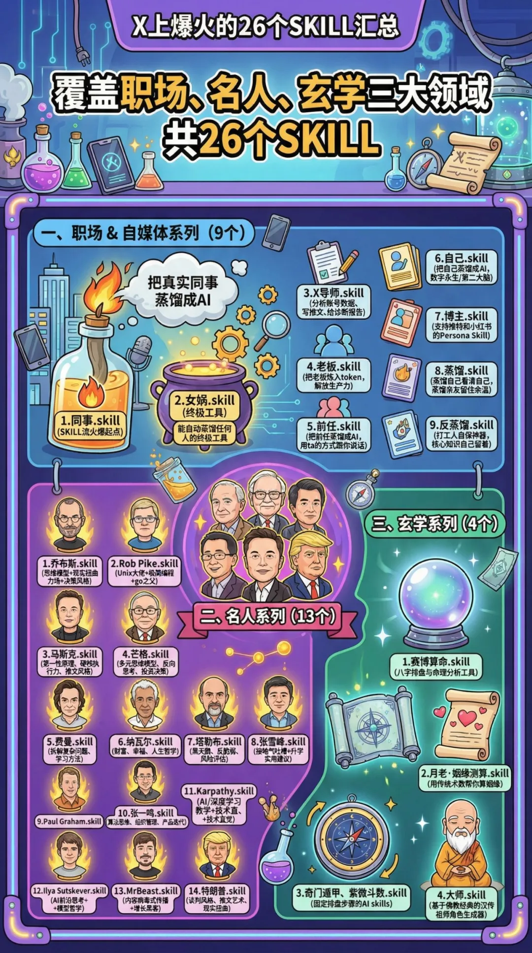 无需代码,一句话将任何人蒸馏成AI!解锁26个实用有趣的SKILL,职场、名人、玄学,总有一款适合你!