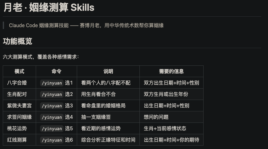 25. 月老 · 姻缘测算.skill(赛博月老)— 用中华传统术数,帮你测算姻缘。单身的朋友可以试试,测一测自己的正缘什么时候到,图个好彩头,缓解单身焦虑。[链接](https://github.com/Ming-H/yinyuan-skills,57 Star)