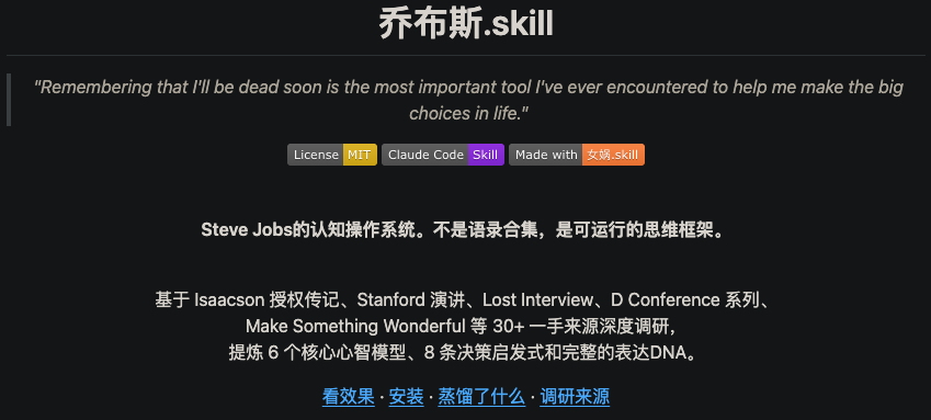 10. 乔布斯.skill — 复刻乔布斯的思维模型、现实扭曲力场与决策风格,已开源。想知道乔布斯是如何做产品决策、打造爆款的?想模仿他的演讲风格?这个开源SKILL能给你最真实的体验,产品人必冲。[链接](https://github.com/alchaincyf/steve-jobs-skill,565 Star)