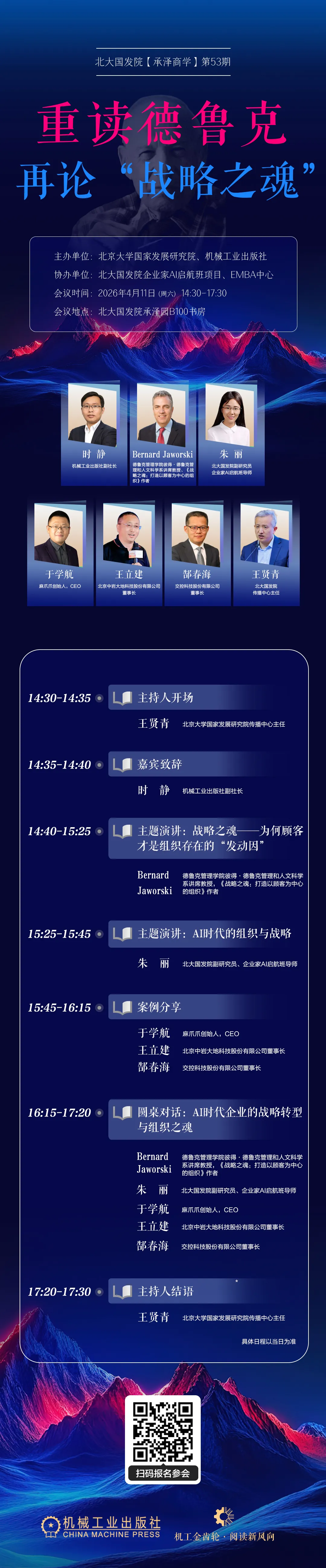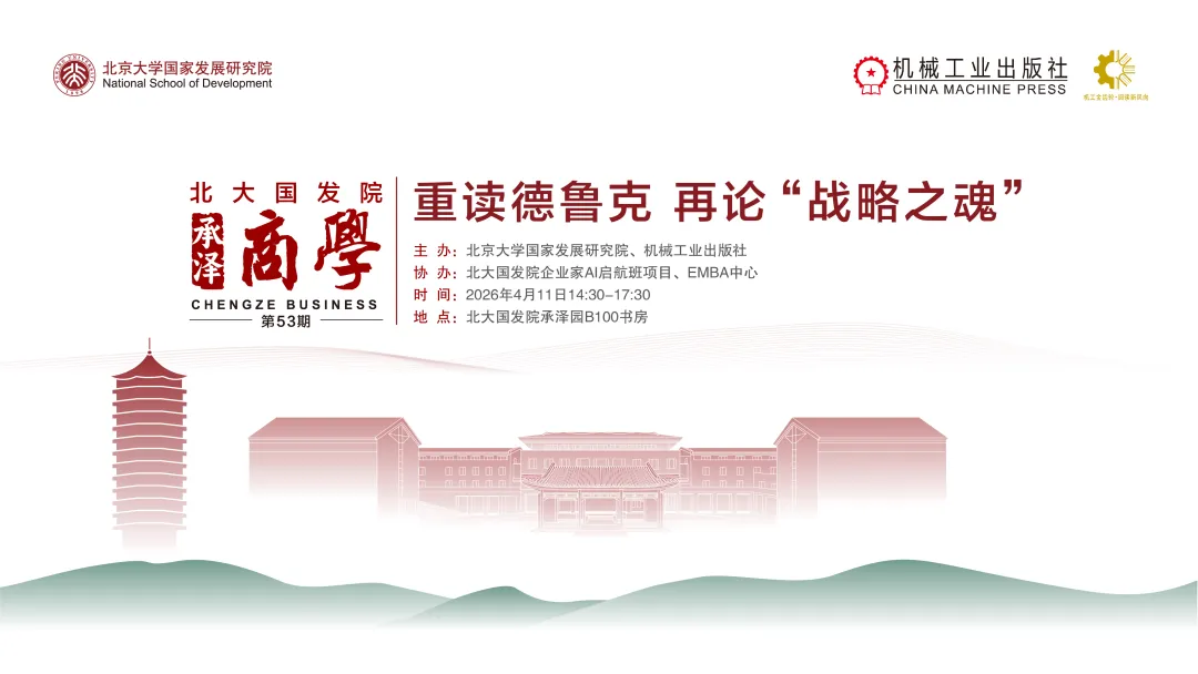 2026年4月11日,北京大学国家发展研究院将举办承泽商学第52期,与机械工业出版社联合邀请到德鲁克管理学院彼得·德鲁克管理和人文科学系讲席教授Bernard Jaworski教授,北大国发院副研究员、企业家AI启航班导师朱丽,以及三位学习应用德鲁克颇有心得的企业家共同研讨新环境下如何重读德鲁克,如何重塑战略之魂。
