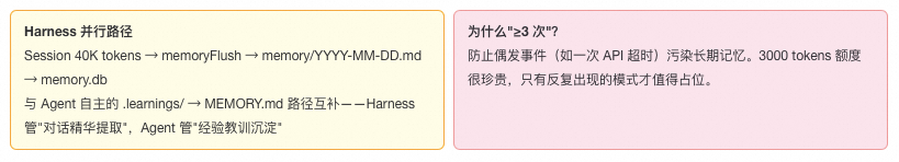 3. 持续运行的系统必然退化——不是 bug,是热力学。配置堆积、记忆过长、session 膨胀、磁盘撑满——这些会确定性地发生。对策不是"一次设置好",而是建立反退化机制栈:compaction 管 session,maintenance 管记忆,heartbeat-guardian 管配置,巡检管行为漂移。用 Agent 运维 Agent,用 cron 监控 cron——每层兜底机制都需要自己的兜底。