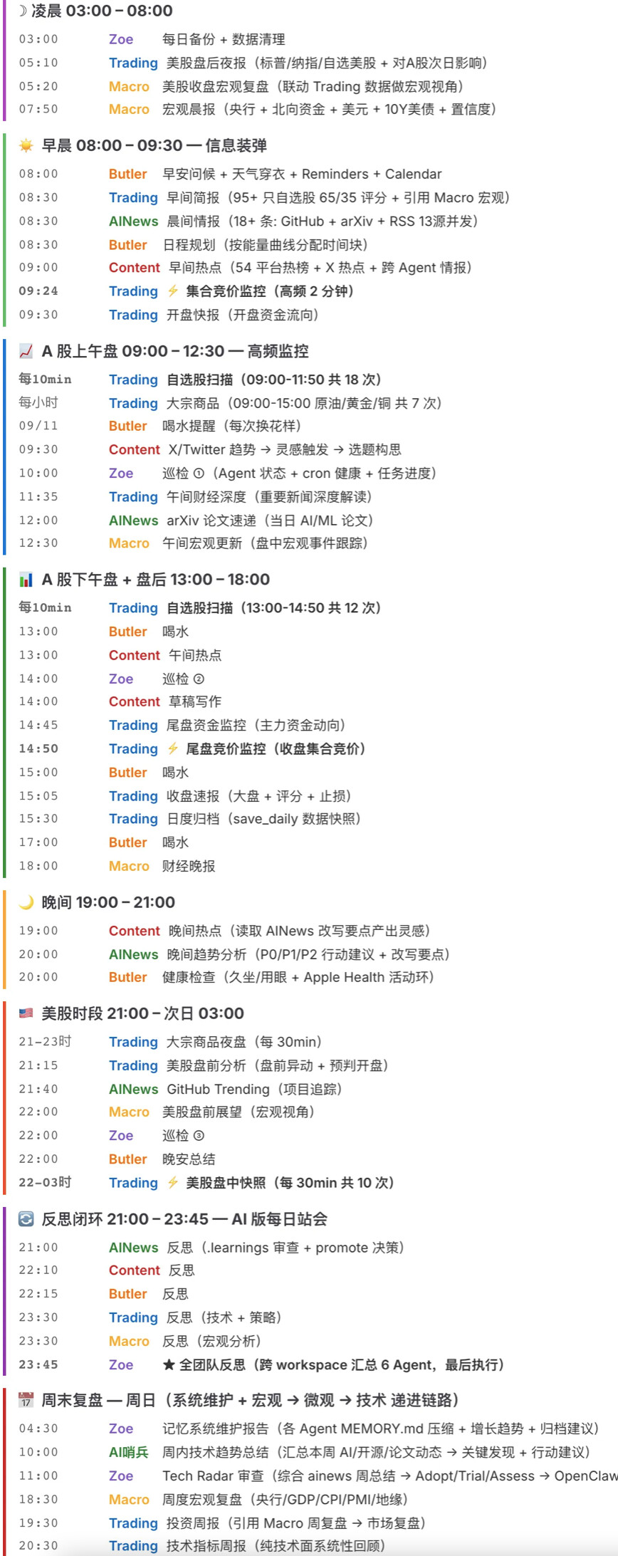 从凌晨 03:00 的自动备份到 23:45 的全团队反思,52 个 cron 任务覆盖 A 股 + 美股双时区自动轮转。周日还有 Macro → Trading → Trading 的三级递进周报。