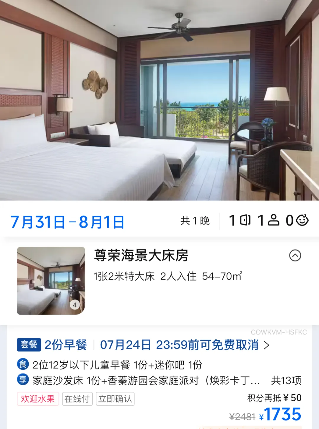房间54m²起,大床房还带个沙发床,打开就是个小双人床,带娃不拥挤。同房型的日历房在暑期1700多,套餐有600的加价,但是多送了欢乐时光,能解决晚餐也是划算的。
