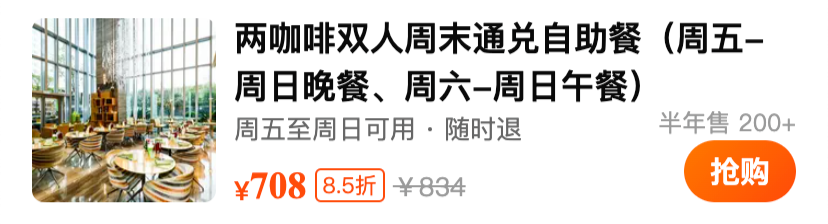 1999元 券后1799元1晚 无早+双人自助午餐/晚餐