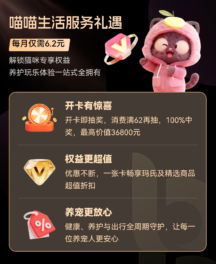 月卡只要6.2元,年卡也才62元,最低不到一杯奶茶的钱,就把养宠的安心、划算和幸福感统统拉满。