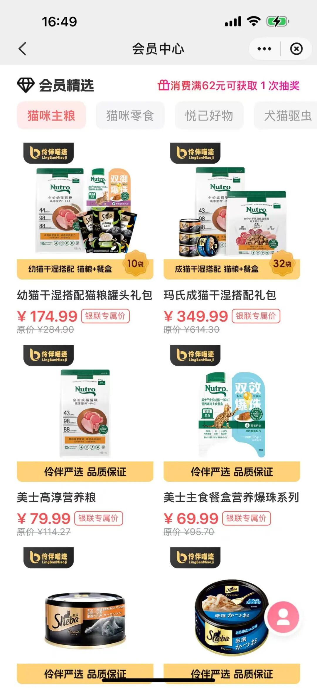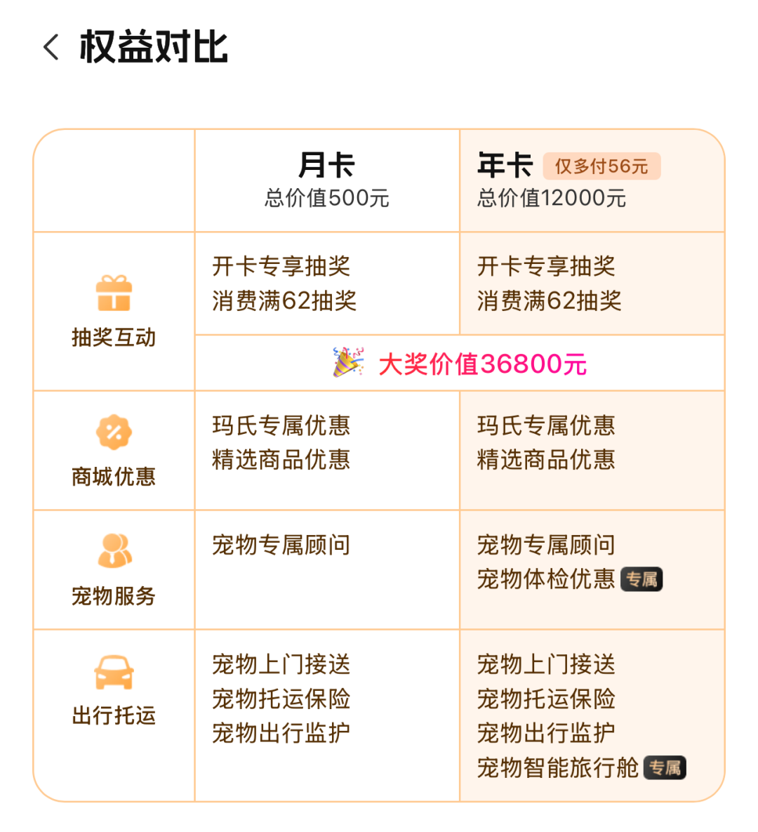 开卡抽奖、宠物顾问、玛氏4折起、精选6折起、满62抽奖、上门接送券、托运保险、出行监护包一样不少。