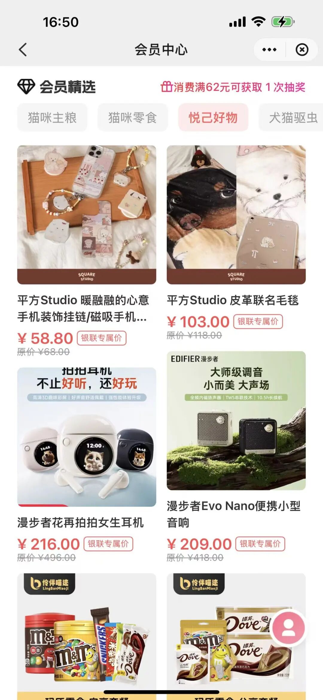 2)精选好物线上6折起,宠物玩具、宠物相关文创产品、3C类产品等都有折扣。小东西单价不高,但加起来也是一笔钱。