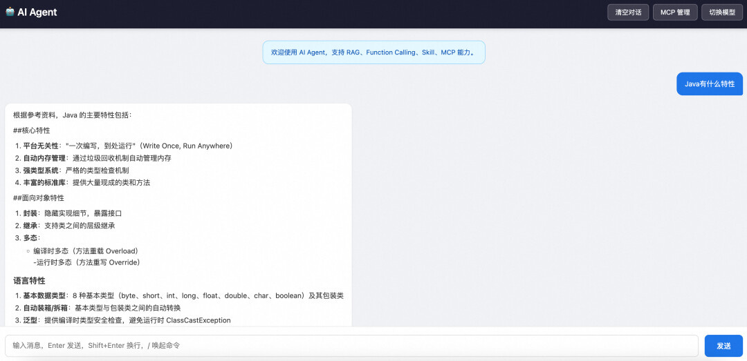 项目内置了一个完整的 Web 聊天界面(src/main/resources/static/index.html),支持: