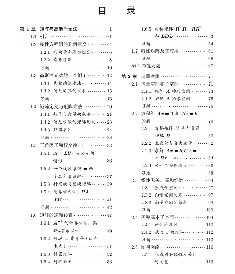 值得一提的是,Strang教授尤其注重几何直觉的培养。他在讲解每个知识点时几乎都会给出几何解释,这种“代数与几何密切相关”的理念,帮助读者在脑海中构建清晰的空间图像,避免沦为“计算机器”。