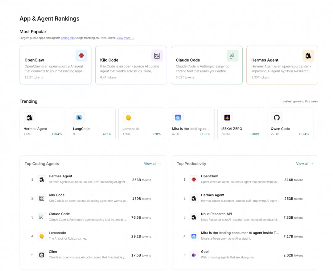 OpenRouter 排行榜上正在发生一场换代:Hermes Agent 增速 +204%,Top Coding Agents 排第一,Top Productivity 排第二。上线不到半年,GitHub 从 0 到 106k+ Star。开发者在用数据说话——选的不是"另一个 OpenClaw",是一种完全不同的东西。