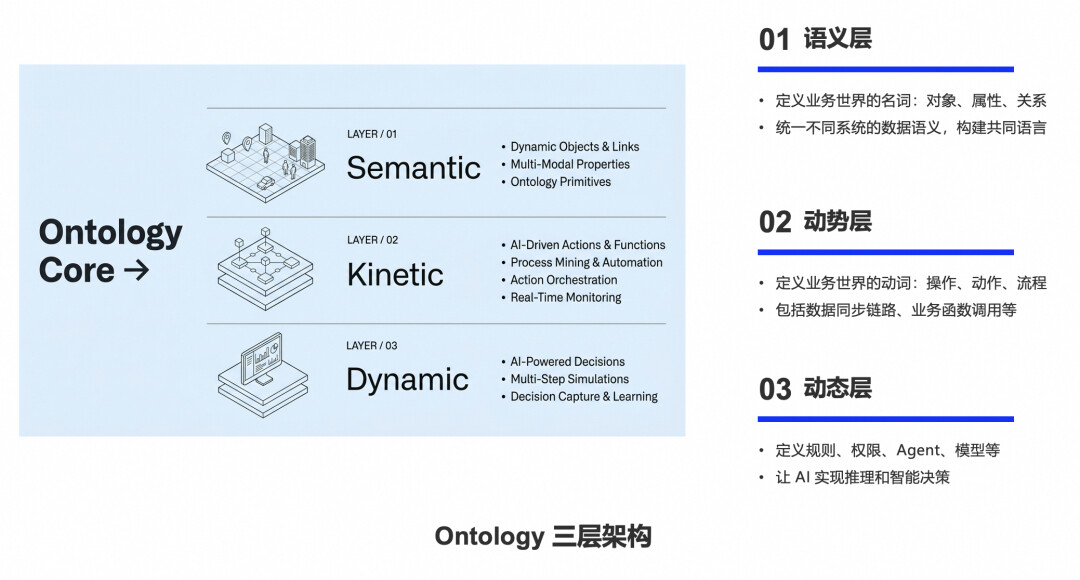 语义层:定义业务世界的"名词"——对象、属性与关系,统一不同系统的数据语义。