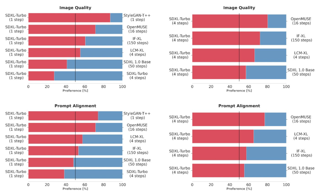 实验通过使用相同的 prompt 生成输出来比较多个不同的模型变体(StyleGAN-T++、OpenMUSE、IF-XL、SDXL 和 LCM-XL)。在盲测中,SDXL Turbo 以单步击败 LCM-XL 的 4 步配置,并且仅用 4 步击败 SDXL 的 50 步配置。通过这些结果,可以看到 SDXL Turbo 的性能优于最先进的 multi-step 模型,其计算要求显著降低,而无需牺牲图像质量。