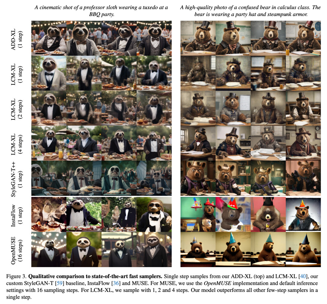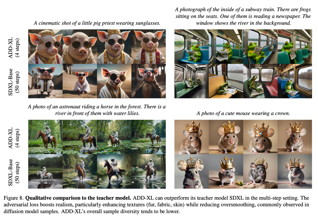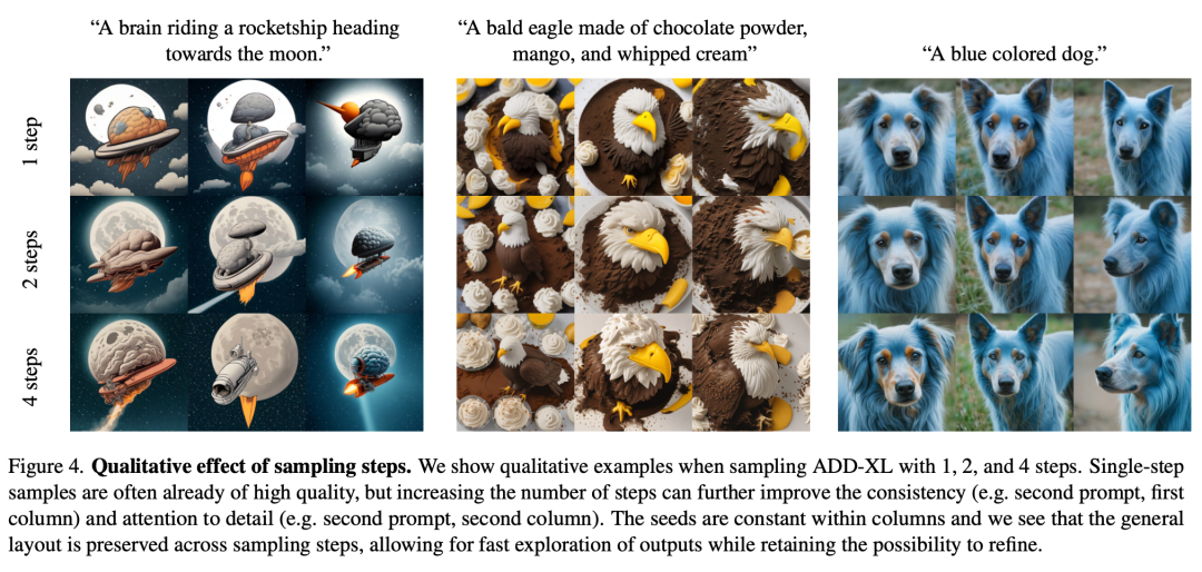 作为定量实验结果的补充,论文也展示了部分定性实验结果,展示了 ADD-XL 在初始样本基础上的改进能力。图 3 将 ADD-XL(1 step)与 few-step 方案中当前最佳基线进行了比较。图 4 介绍了 ADD-XL 的迭代采样过程。图 8 将 ADD-XL 与其教师模型 SDXL-Base 进行了直接比较。正如用户研究所示,ADD-XL 在质量和 prompt 对齐方面都优于教师模型。