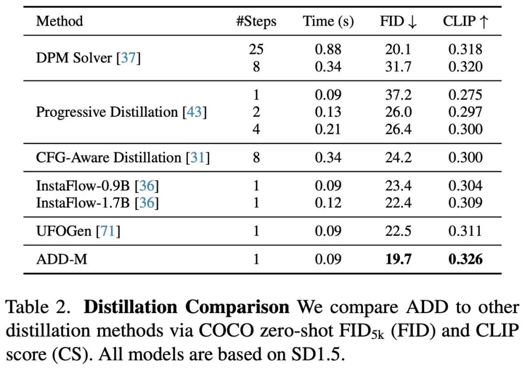 表 2 比较了使用相同基础模型的不同 few-step 采样和蒸馏方法。结果显示,ADD 的性能优于所有其他方法,包括 8 步的标准 DPM 求解器。