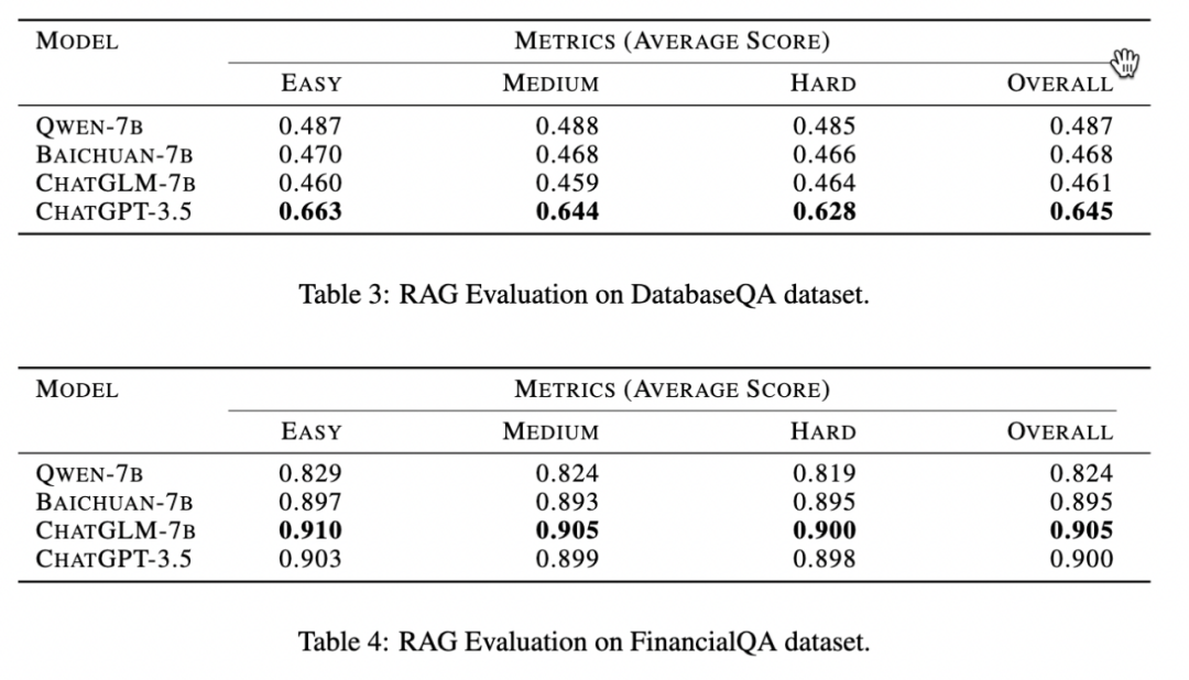 为了确保答案质量评估准确性,论文指定三位专家对每个回复进行打分,评分范围为 0 – 5 分,其中较高分数代表更为优质的答案。评分结果取三位专家评分的平均值,以此作为最终得分。论文选取 4 个 LLM 作为基础模型,分别是:Qwen、Baichuan、ChatGLM 和 ChatGPT3.5。由于 ChatGPT3.5 并非开源模型,作者无法在框架中对其进行 Text-to-SQL 的微调。RAG 在两个数据集上的实验结果如表 3 和表 4 所示,在所有测试的数据集上,并没有一个模型能够在所有的情况下都胜出:ChatGPT-3.5 在 DatabaseQA 数据集上表现最佳,而 ChatGLM 在 FinancialQA 数据集上获得最佳性能。DB-GPT 集成了大部分流行的开源和商业 LLM,用户可以根据自己的 RAG 任务需求自由选择最适合的模型。